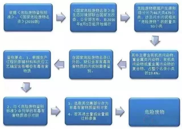 依據(jù)由環(huán)境保護(hù)部聯(lián)合國家發(fā)改委、公安部發(fā)布自2016年8月1日起開始施行的《國家危險(xiǎn)廢物名錄》(公眾號內(nèi)回復(fù)”危廢名錄“下載)和《危險(xiǎn)廢物鑒別標(biāo)準(zhǔn) 通則》,結(jié)合住建部、環(huán)保部、科技部于2009年2月28日聯(lián)合發(fā)布的《城鎮(zhèn)污水處理廠污泥處理處置及污染防治技術(shù)政策(試行)》,五步即可判定污水污泥是否屬于危險(xiǎn)廢物,如下圖所示: